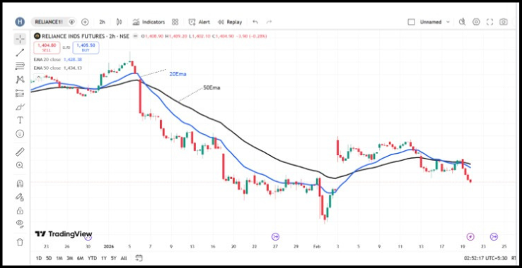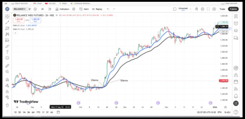 Bullish Crossover – When the 20 EMA cuts the 50 EMA from below and moves above it, buyers are stepping in, and the stock value starts moving up. That’s your buy signal.