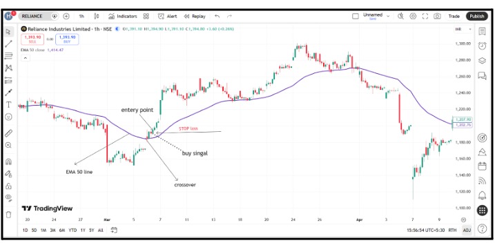 When the price moves from below the 50 EMA to above it, it signals a potential shift from bearish to bullish conditions. This crossover suggests that buyers are gaining control, and the older downtrend may be weakening.