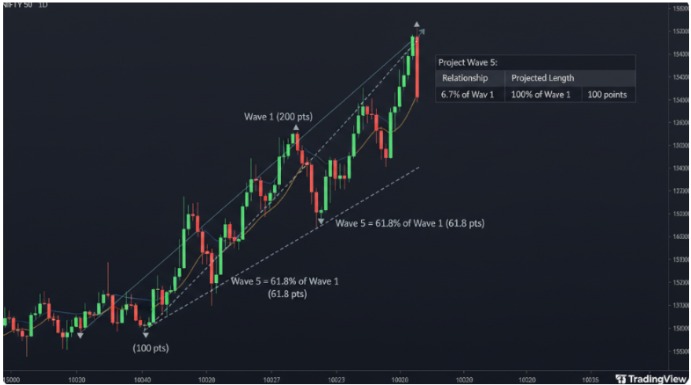 Most traders will project from the end of Wave 4 using Fibonacci extension tools in platforms like TradingView.