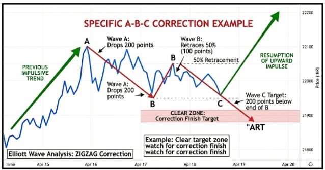 - Wave C target becomes 200 points below Wave B’s end, giving traders a clear zone to watch for the correction to finish.