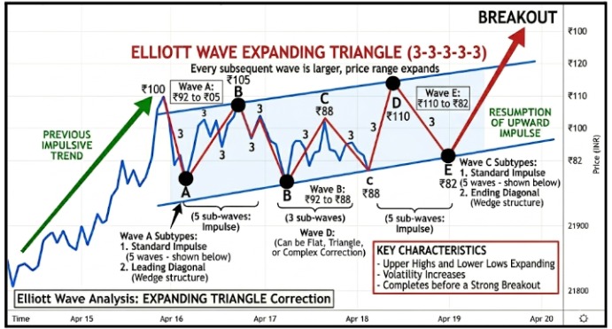 In Elliott Wave Theory, expanding triangles usually appear in corrective phases, especially wave B or wave 4.