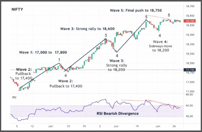 RSI shows bearish divergence during Wave 5.