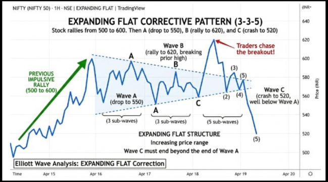 NIFTY rallies from 500 to 600. Wave A drops to 550. Wave B shoots up to 620, breaking the prior high. Traders chase the breakout. Then Wave C crashes to 520.