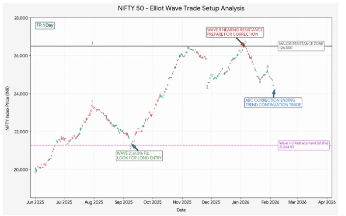 Note: You can open a daily chart of any liquid stock or index, identify the most recently completed impulse or corrective structure, and label it correctly on TradingView without making rule violations.