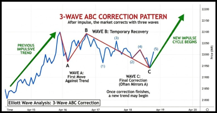 After the five-wave move, the market forms a three-wave correction labeled A B C.