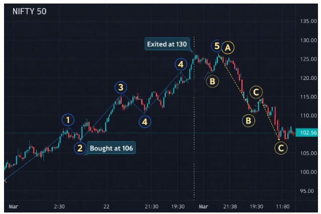 Nifty breaks resistance. That is likely Wave 1. Small pullback forms Wave 2. Once price breaks Wave 1 high with volume, that is early Wave 3 entry.