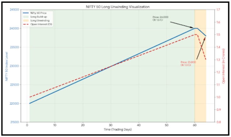 In simple terms, long unwinding occurs when traders who previously bought futures or options exit their positions, leading to a fall in both price and open interest.
