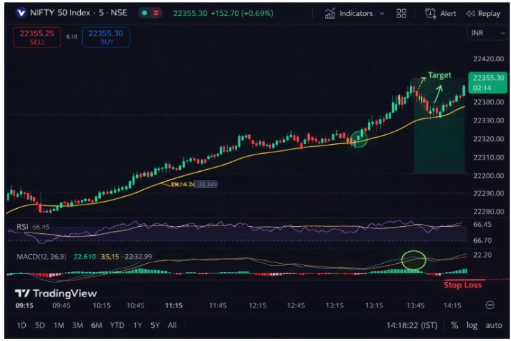 - Use a moving average to establish the trend direction. The 20 EMA or 50 EMA works well on 5 and 15-minute Nifty charts. When the price stays consistently above the EMA, the bias is bullish.
