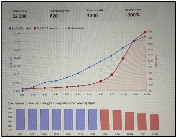 This massive wave of forced buying at the 52,200 strike causes the premium to skyrocket—sometimes jumping from ₹20 to ₹200 in minutes.