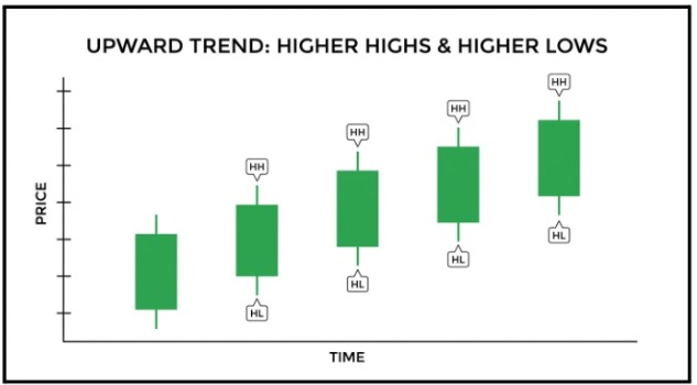 अगर मार्केट बार-बार Higher Highs (नया high) और Higher Lows (ऊपर का low) बना रहा है, तो ये साफ़ Uptrend होता है।