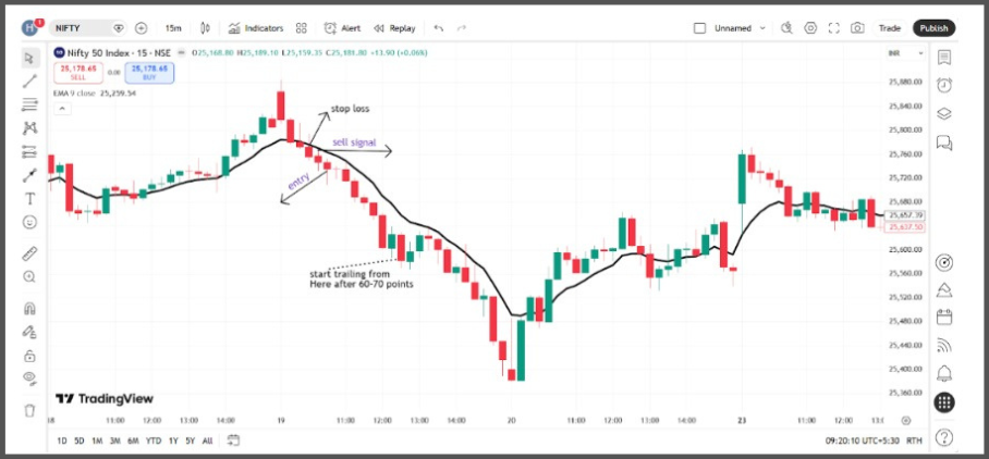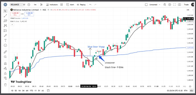 But VWAP provides insight into where the price should be at any given moment, as it resets daily at 9:15 AM. Meanwhile, the 9-EMA shows the current direction of the price movement.