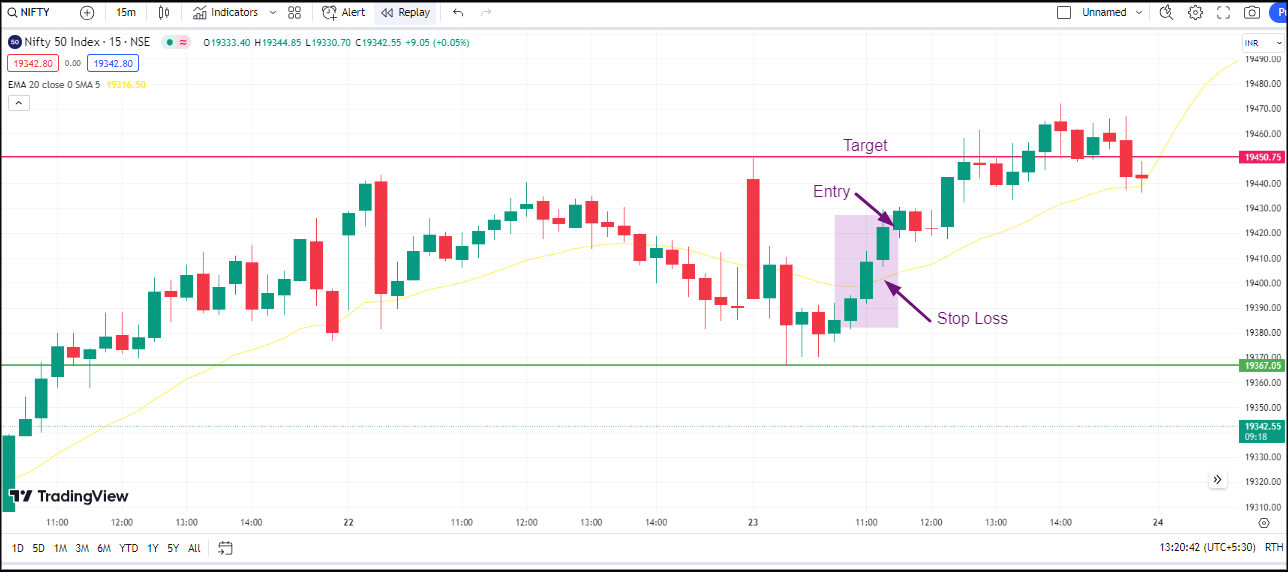As shown in the image above, the second candle of three white soldiers breaks the EMA 20 indicator which itself is the bullish signal and the third candle takes the support on the moving average line which gives an indication of the strong bullish trend.Â